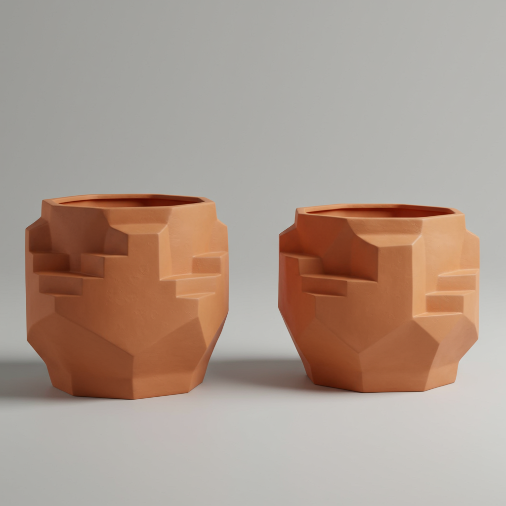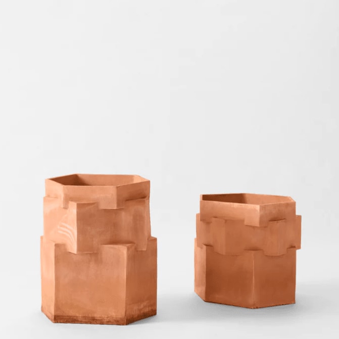 A geometric planter in raw terracotta. Artist Bari Ziperstein, known as B Zippy, creates planters and vases inspired by the history of California ceramics, Brutalist design, and Cold War-era architecture.