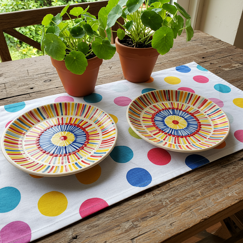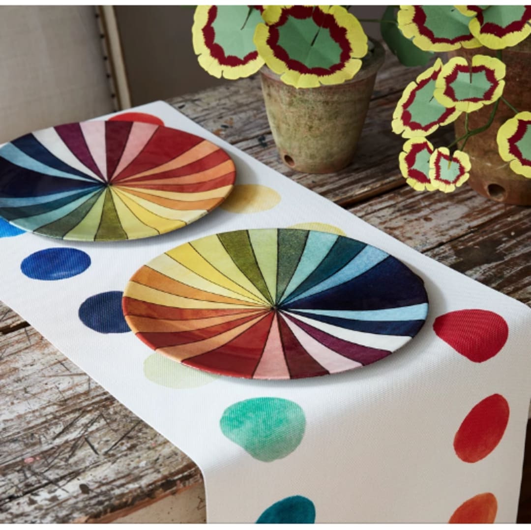 This table runner is part of Johns collaboration with the company Chiliwich. Its a fun and happy collaboration. theres also great placemats. This is for the artist in your life or at least the collector. They are fantastic !