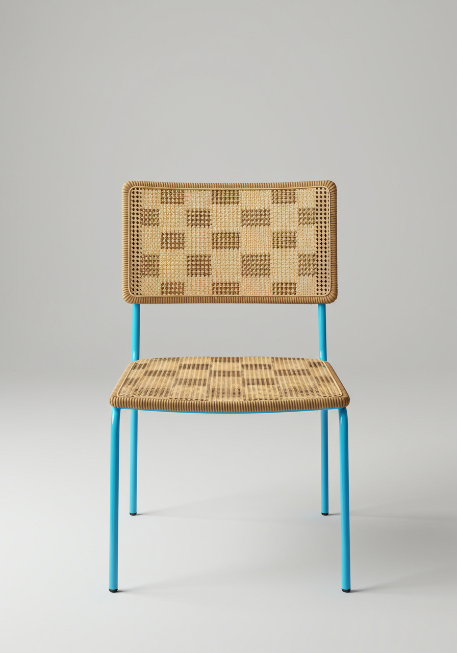 Chair with a colored metal structure and a multicolored woven seat, back and armrests.
