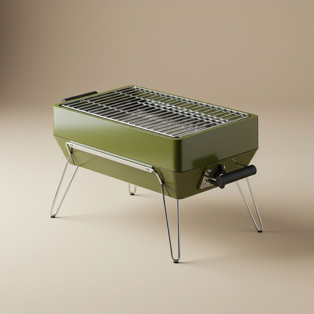 Portable camping barbecue suitable for outdoor use with a grill, steel structure and legs. Folds easily to become a practical case with latch fastening and a handle at the top for easy transport and storage.