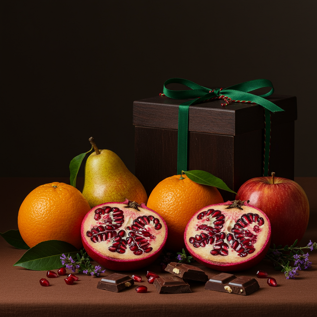Thanksgiving Pippin features a medley of seasonal fresh fruit - apple, pear, pomegranate and blood orange - complemented with handmade Chocolate Turkeys by L.A. Burdick Chocolates. These delectable chocolate turkeys are hand-piped and boast a tail of almond feathers. Each box holds two dark chocolate turkeys and two milk turkeys. Dark Turkeys: Dark chocolate ganache blended with cranberries. Enrobed in dark chocolate.