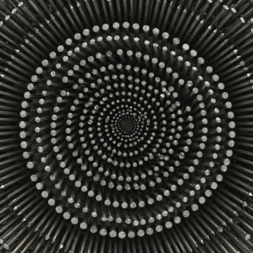 To create his signature nail paintings, Uecker stretches canvas over thick panels of wood; works a mixture of white paint and carpenter’s glue into a dense, visceral surface; then hammers nails into the panels, varying their placement, angle, and groupings intuitively to form undulating painted reliefs that cast shadows in constant motion.