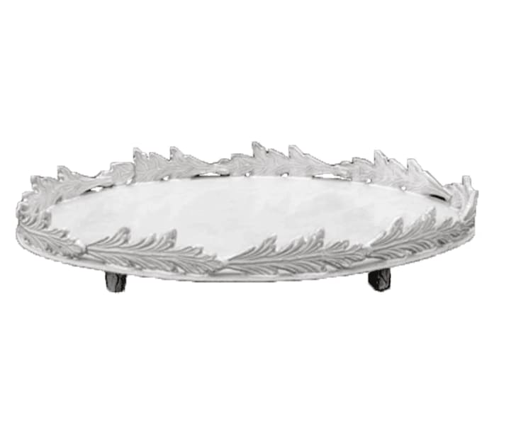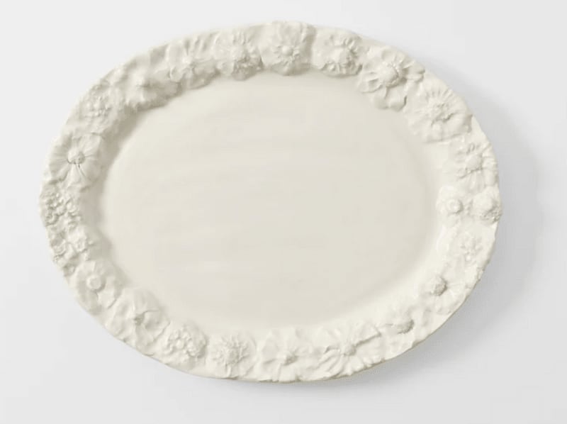 A shiny white porcelain platter featuring the artist’s signature flower relief design.