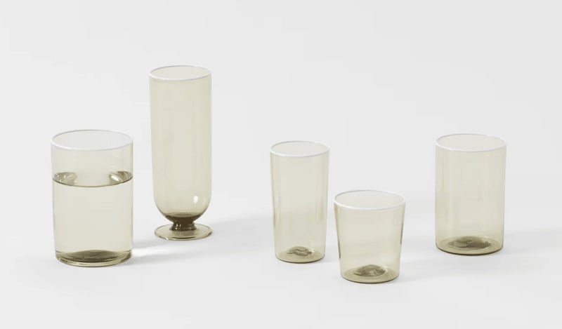 Petite yet durable hand-blown glassware in a smoked olive tint with white trim.