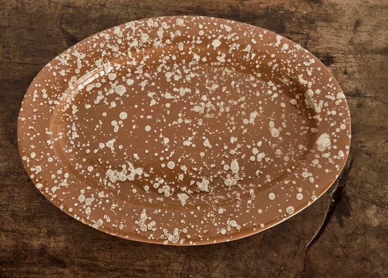 Carmel's casual shapes and unique speckles refresh classic dinnerware with artisanal charm. Bordered with perfectly imperfect ridges, each terracotta platter is finished by hand with a cream-colored reactive glaze that creates unique constellations of tiny flecks.
