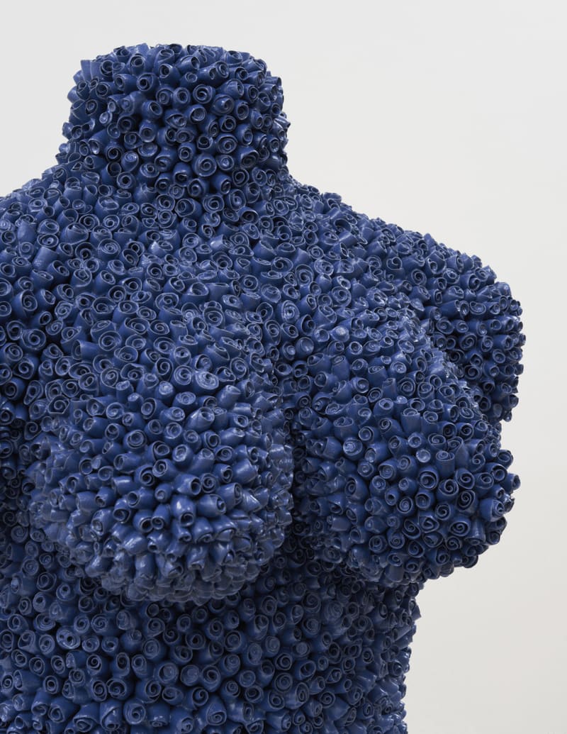 Each of Leigh’s new sculptures presents an image of a partially abstracted female bod. The highly detailed surfaces of these works reference the repetition of handwork and unacknowledged acts of labor and care traditionally associated with women’s work.