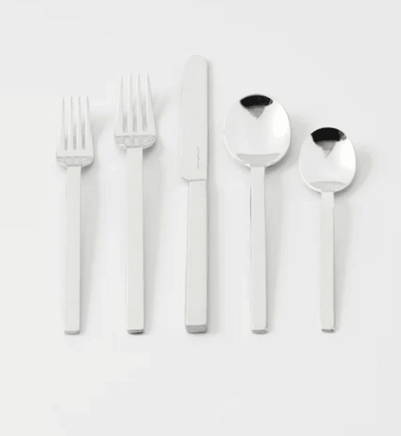 A set of everyday flatware designed with elongated form and a polished finish. Made of 18/10 stainless steel.