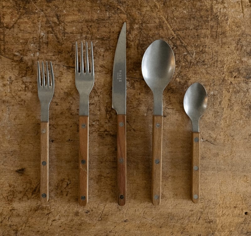 ​​​​​​​Five piece flatware from flatware extraordinaires Sabre Paris. Established in France in 1993 by Francis Gelb, Sabre. All pieces made in France using natural teak and 18/10 stainless steel.