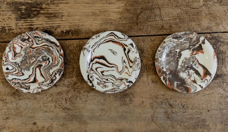 Marbleized lightweight ceramic plates handmade in Portugal by Totem Home. Can be used to set the table or as an object adorning anywhere in home. Each one is its own unique beauty.